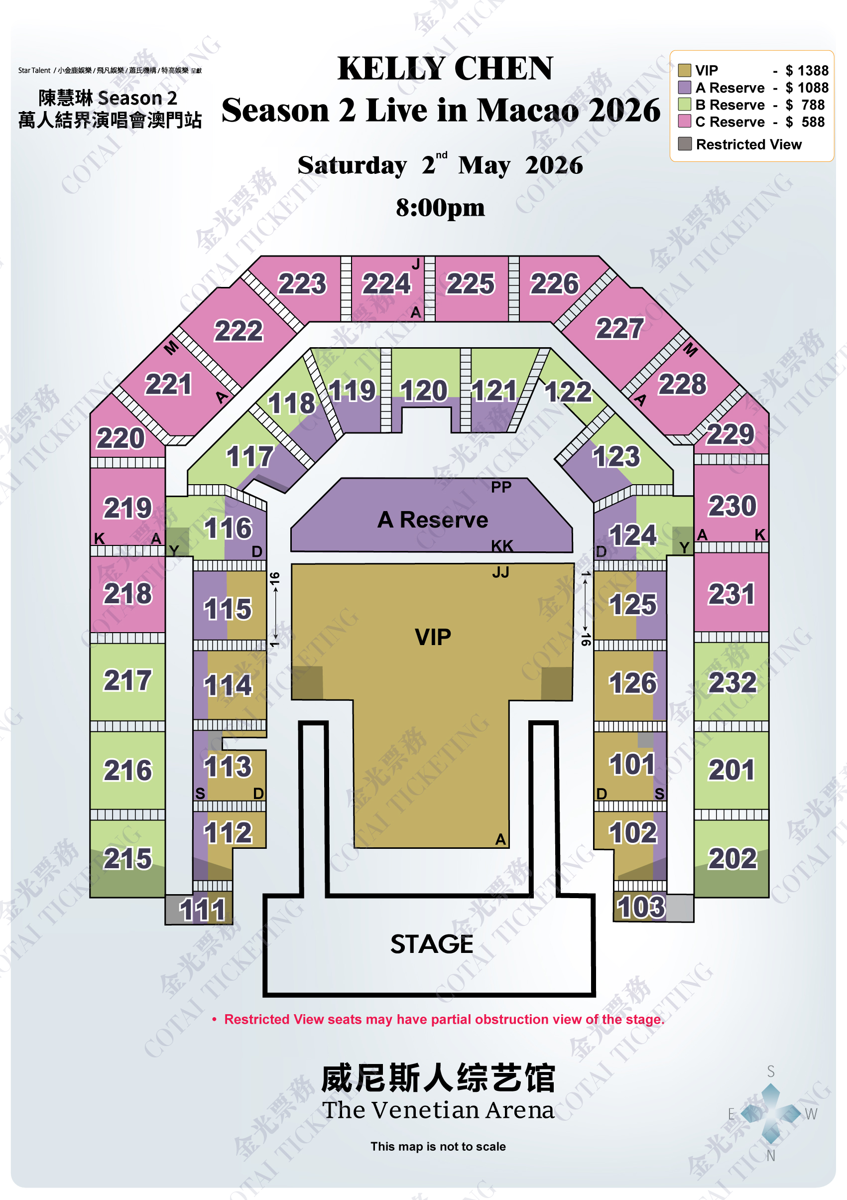 每人每笔交易只限购买8张门票。如交易购票数目超过相应限额,金光票务保留取消门票的权利,恕不另行通知。此限制并包括重复购票使用相同姓名,地址或信用咭。