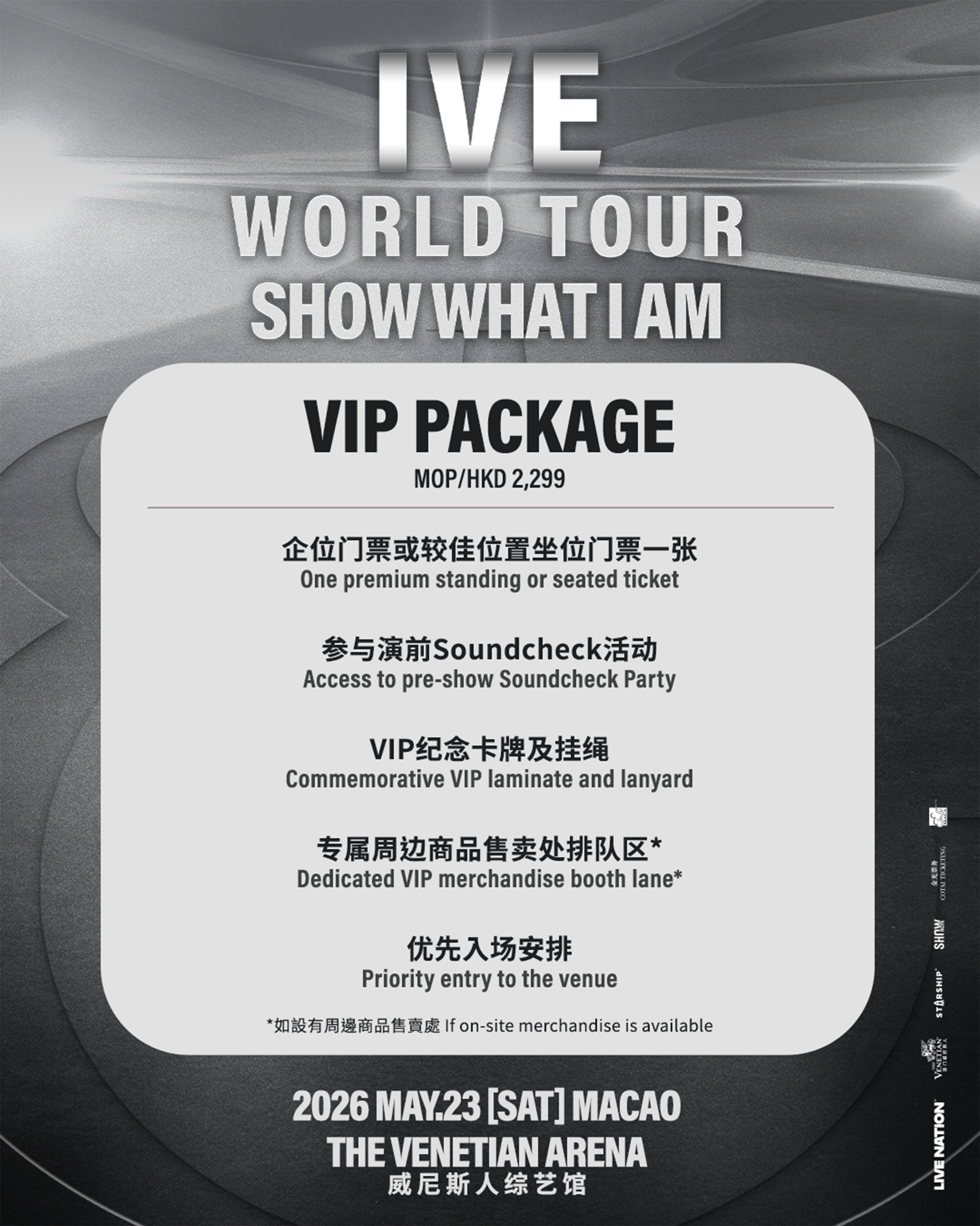 韩国人气团体 IVE (ANYUJIN, GAEUL, REI, JANGWONYOUNG, LIZ, 和 LEESEO),正式公布备受期待的第二次世界巡回演出《SHOW WHAT I AM》,将于2026年5月23日(星期六)在威尼斯人综艺馆盛大开唱。